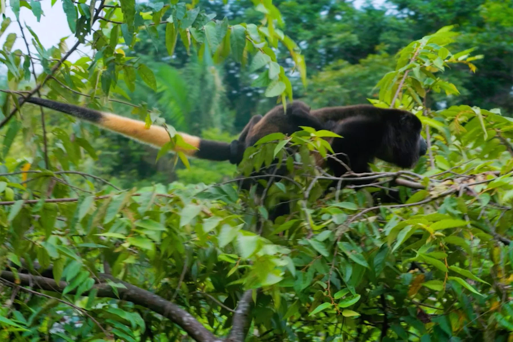 Howlers are vegetarians. Their diet is mostly made up of leaves, with some flowers, nectar, and fruit as well, when they can find it. They use their strong prehensile tails to hang from the top tree branches to reach the newest leaves—those tend to have more protein and fewer toxins. Leaves don’t give them a lot of energy, so they have to be careful about how they spend it. (This is why they nap….a lot.)