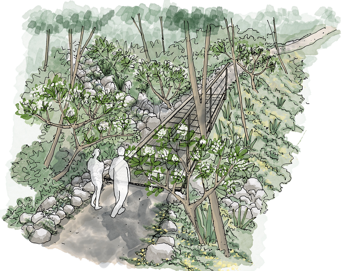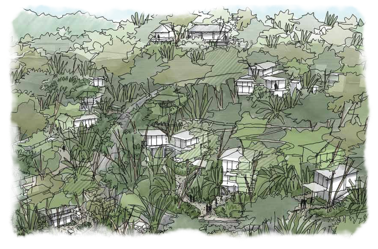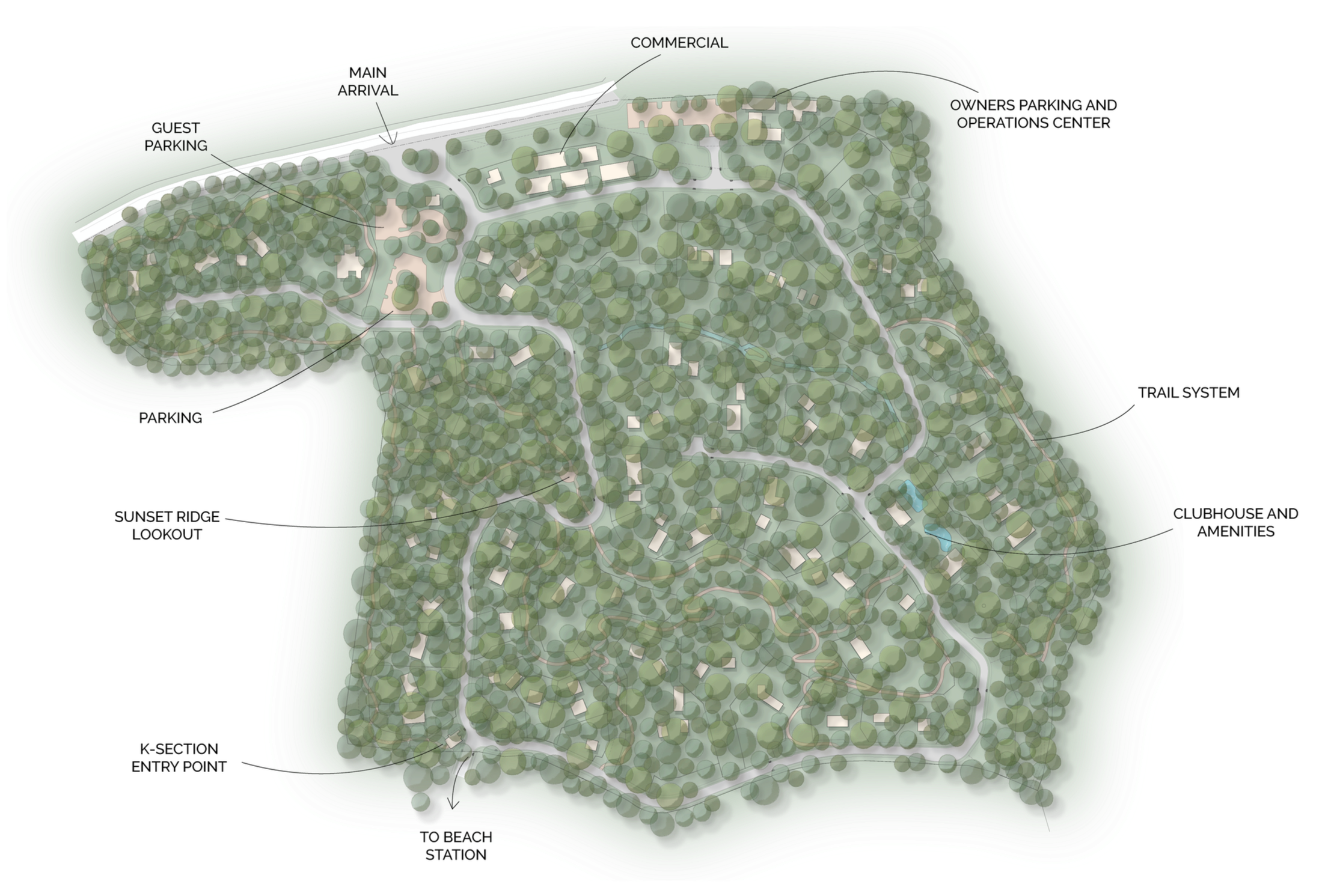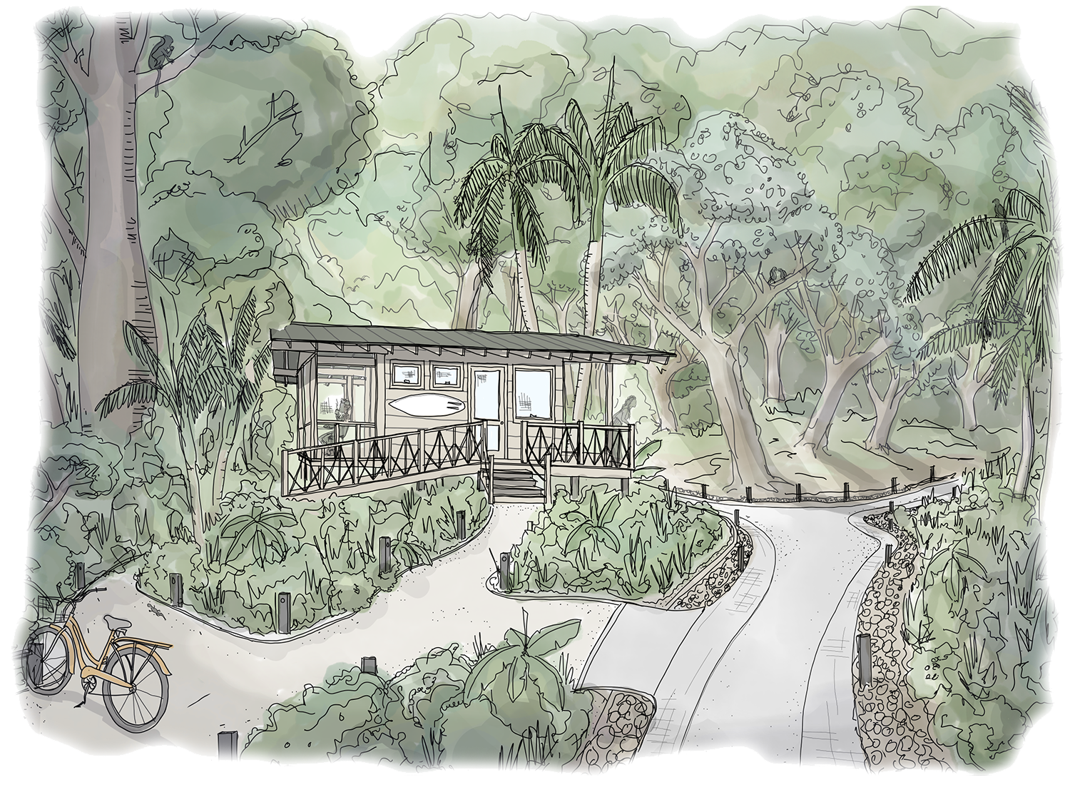 We have designed the “nuts and bolts” of the community to blend in and harmonize with the natural ecosystem, while ensuring that residents have all they need for reliability and convenience. Utilities like electricity and network cables are buried to shelter them from the elements, and to protect wildlife throughout the site. Drinking water is sourced from our own well, and stormwater is managed by beautifully constructed swales, which mitigate runoff and give rainwater the chance to slow down and soak into the ground before reaching the sea.